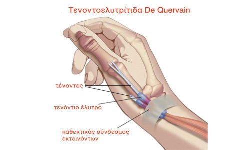 Αφορά σε δύο τένοντες του αντίχειρα, τον μακρό απαγωγό και τον βραχύ εκτείνοντα, οι οποίοι ευθύνονται για την έκταση και την “απομάκρυνση” του αντίχειρα από το υπόλοιπο χέρι. Οι τένοντες κινούνται μέσα σε σωλήνες (σύνδεσμοι) στους οποίους ολισθαίνουν στο ύψος του καρπού, τα λεγόμενα έλυτρα. Η επαναλαμβανόμενη κίνηση του τένοντα προκαλεί πάχυνση και πρήξιμο αυτού του ελύτρου, δημιουργώντας έτσι το εν λόγω σύνδρομο.