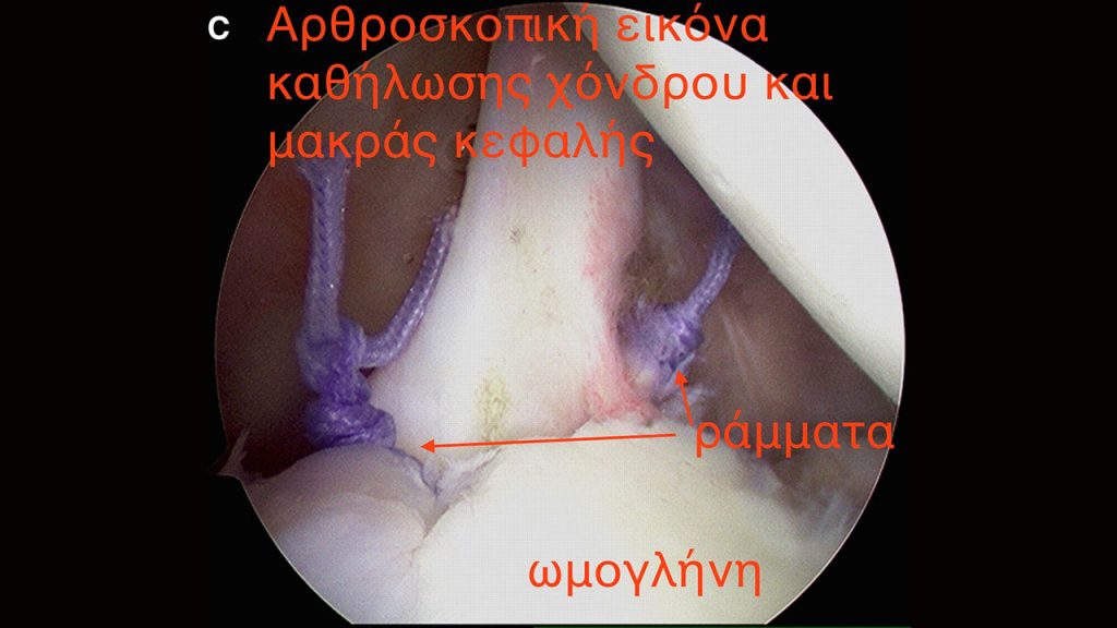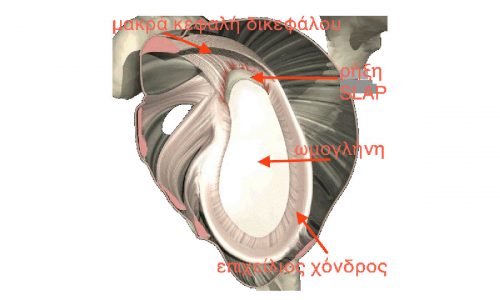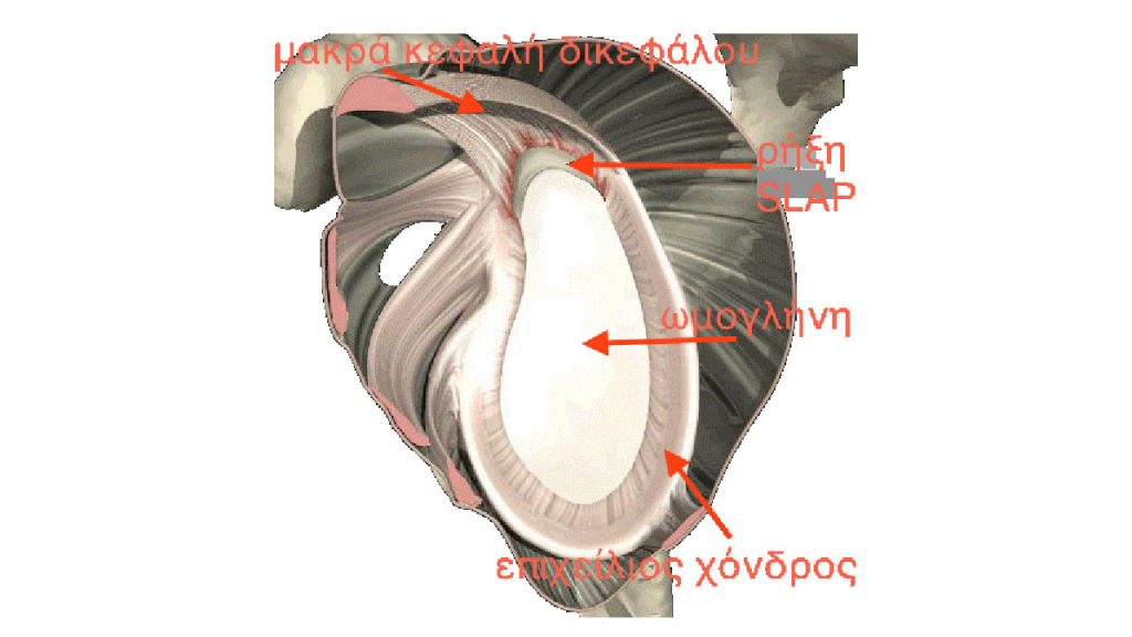 Στο άνω μέρος του επιχείλιου χόνδρου καταφύεται και η μακρά κεφαλή του δικεφάλου, η οποία είναι ο ένας από τους δύο άνω τένοντες του δικεφάλου μυός. Η ρήξη τύπου SLAP (πρόκειται για ακρωνύμιο που σημαίνει superior labrum anterior to posterior), δηλαδή ρήξη του άνω τμήματος του επιχείλιου χόνδρου αφορά αυτή ακριβώς την περιοχή.