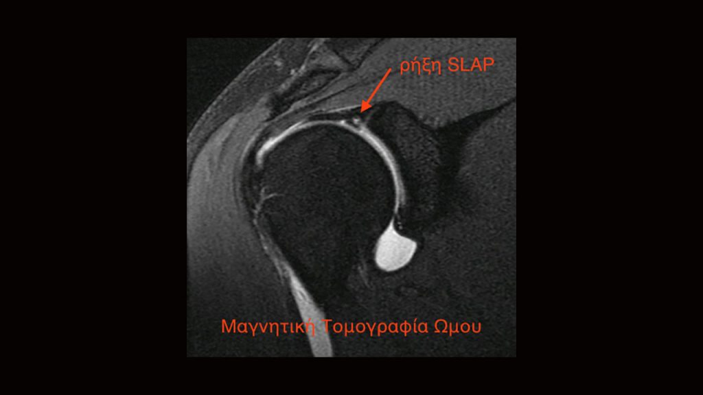 Η ρήξη τύπου SLAP δύναται να είναι μεμονωμένη ή να συνυπάρχει με ρήξη του στροφικού πετάλου (λινκ), αστάθεια του ώμου(λινκ) ή σύνδρομο εσωτερικής πρόσκρουσης. Παρουσιάζεται με βύθιο συνήθως ασαφή πόνο στον ώμο, άλλοτε μπροστά και άλλοτε πίσω. Κατά την κίνηση της άρθρωσης ενδέχεται να υπάρχει κριγμός ή εμπλοκή.